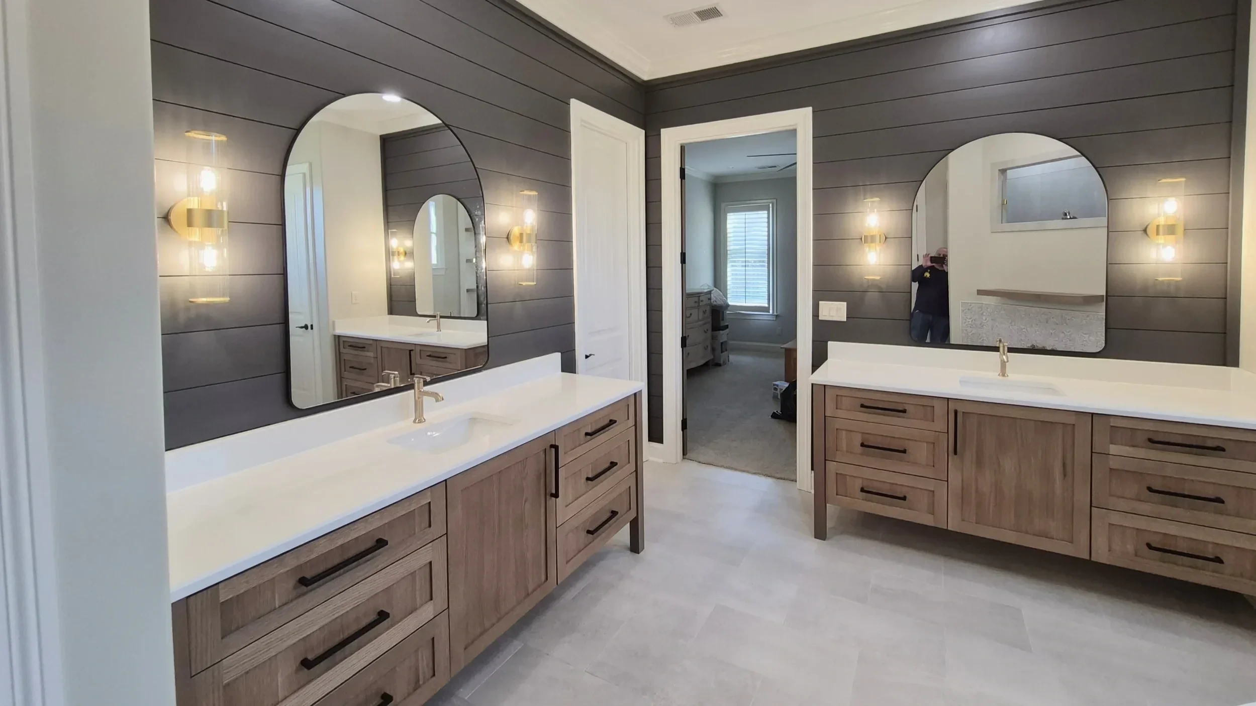 Coordinating tile behind vanities for a luxe backsplash